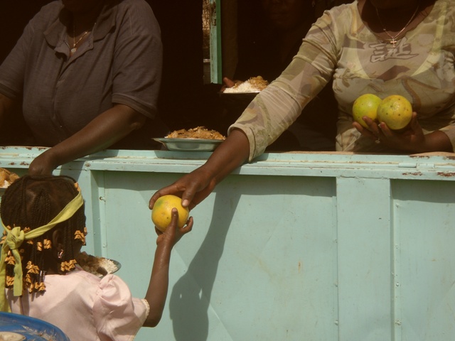 Mais au Burkina, une fête c’est aussi de bons repas. Nous offrons donc à nos enfants ce qu’ils n’ont pas chez eux : une orange, un yaourt, du poisson et beaucoup de riz et de spaghetti.