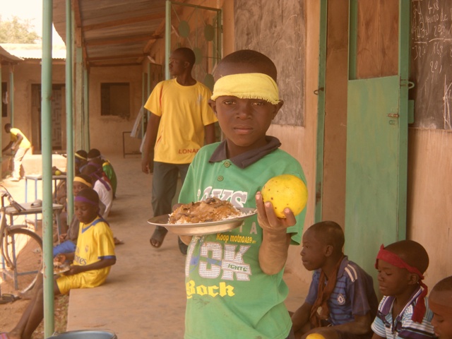Mais au Burkina, une fête c’est aussi de bons repas. Nous offrons donc à nos enfants ce qu’ils n’ont pas chez eux : une orange, un yaourt, du poisson et beaucoup de riz et de spaghetti.